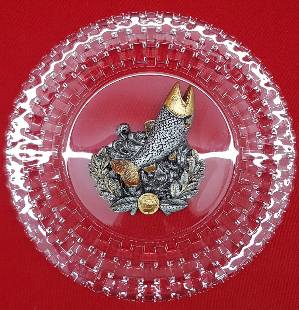 Großer Glasteller 27cm mit Fischfigur-Auflage und Metallständer